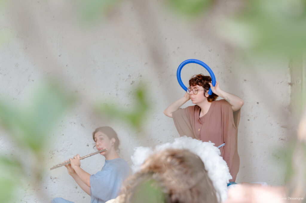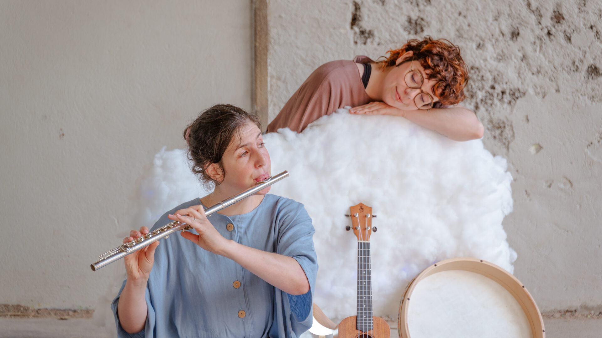 Accompagnées par un nuage cotonneux et un oiseau lumineux, deux artistes musiciennes explorent le